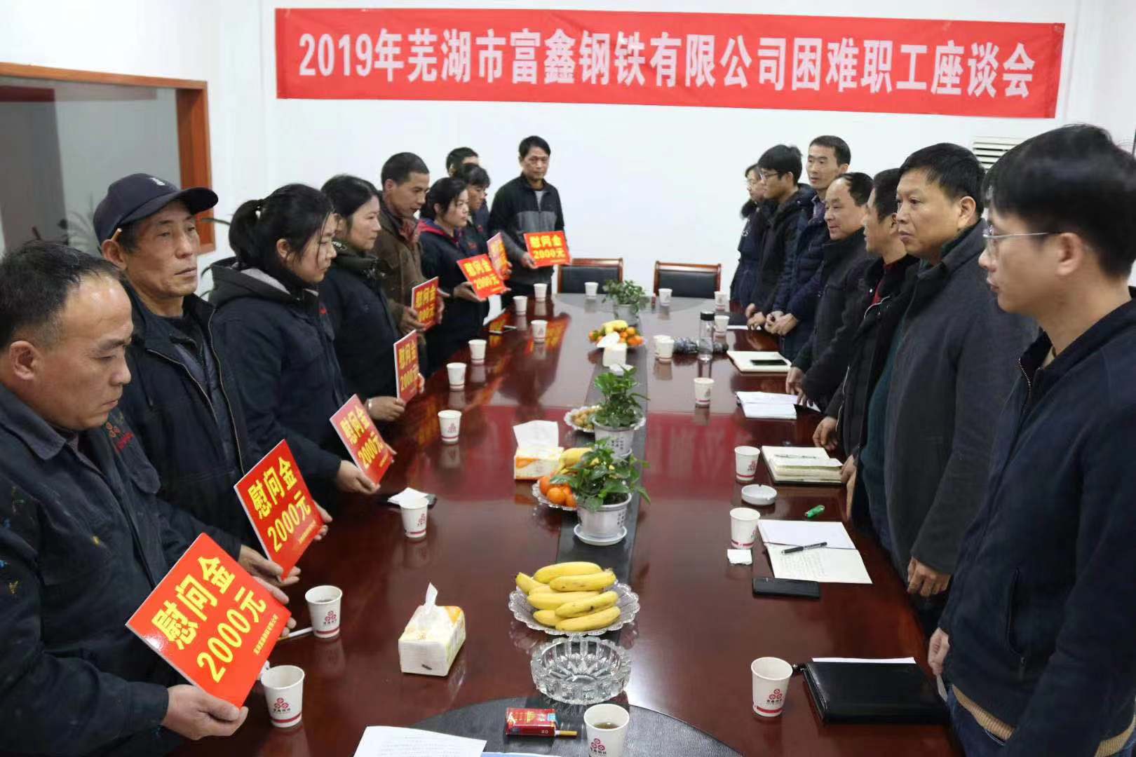2020年春節(jié)將至,為讓困難職工度過(guò)一個(gè)溫暖祥和的春節(jié),1月7日上午,公司工會(huì)組織召開2019年度蕪湖市富鑫鋼鐵有限公司慰問(wèn)困難職工座談會(huì)。縣總工會(huì)黨組成員/副主席阮熙明、縣經(jīng)信局黨委委員/副局長(zhǎng)戴元根、縣經(jīng)信局黨委委員/系統(tǒng)工會(huì)主席郝建 、縣總工會(huì)法工部副部長(zhǎng)張陽(yáng)、新港鎮(zhèn)總工會(huì)主席湯向東應(yīng)邀出席會(huì)議,公司10名困難職工代表參加會(huì)議。
